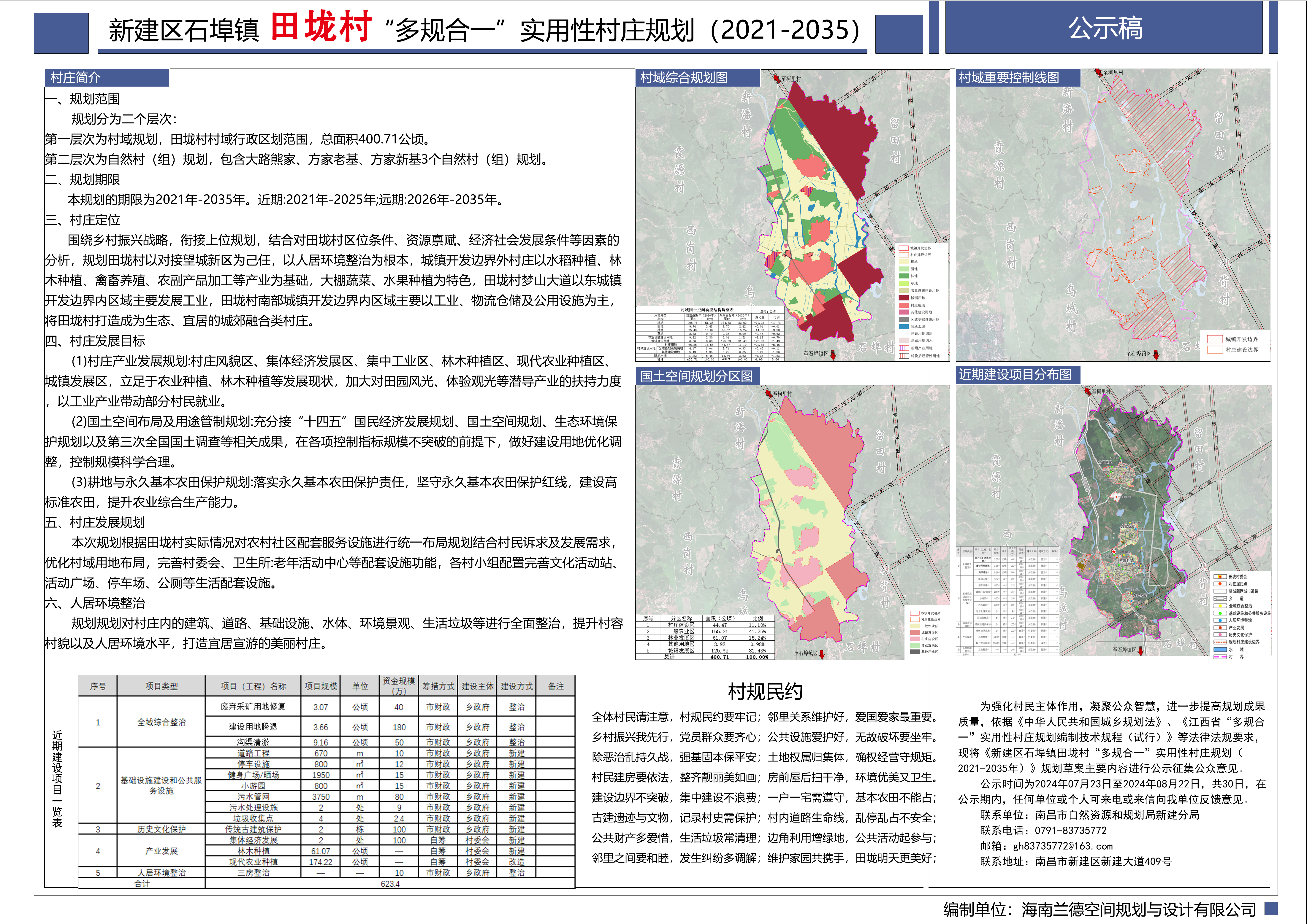 石埠镇田垅村“多规合一”实用性村庄规划(2021-2035年)》规划草案主要内容进行公示征集公众意见。