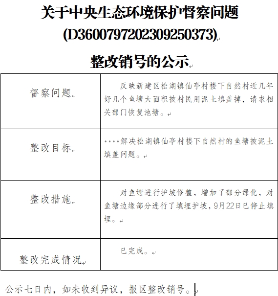 关于中央生态环境保护督察问题(D3600797202309250373)整改销号的公示
